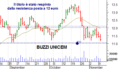 Ma come si vede anche dal grafico nelle ultime sedute la situazione di Buzzi Unicem si è deteriorata notevolmente, con il valore del titolo che ha subito un brusco calo subito dopo il fallito attacco alla soglia psicologica e alla barriera poste a quota 12 euro.