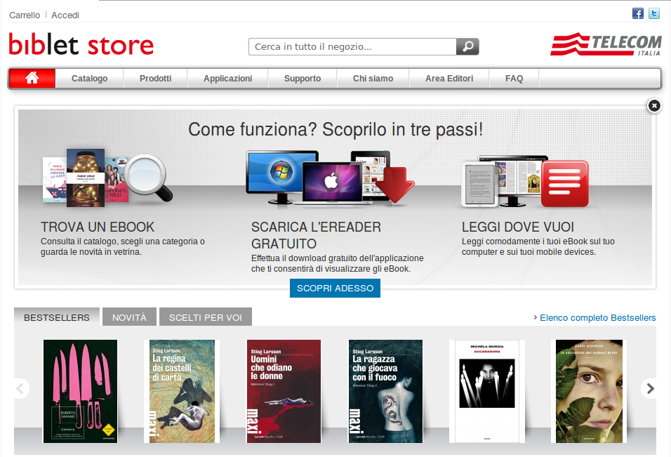 Sulla piattaforma Telecom Biblet Store sono già disponibili 672 libri in formato digitale, i famosi e-book, tra cui per esempio Il cimitero di Praga di Umberto Eco e La pancia degli italiani, Berlusconi spiegato ai posteri di Beppe Severgnini.